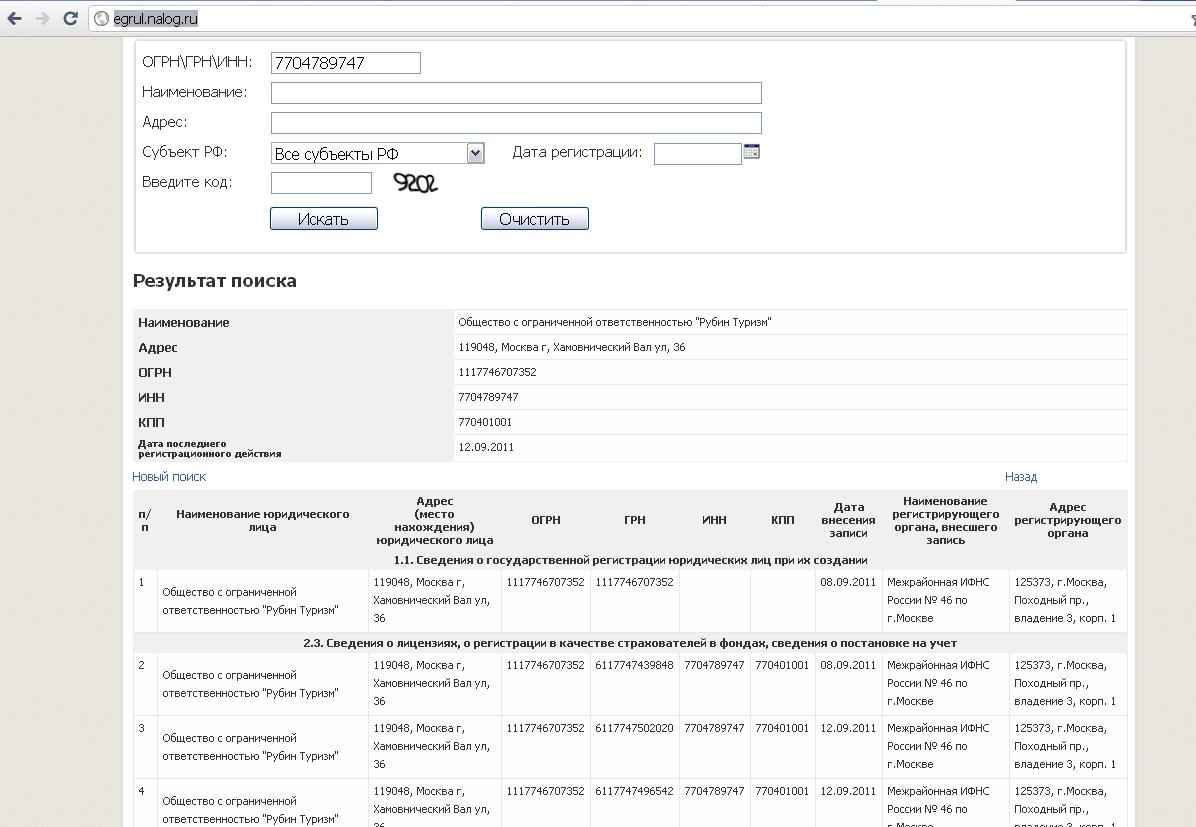 После легкого интернет-серфинга мы решили проверить существование компании «Рубин Туризм». В договоре, который мы от них получили, были указаны реквизиты компании. Зашли на сайт egrul.nalog.ru, ввели указанный в договоре ИНН и увидели вот что