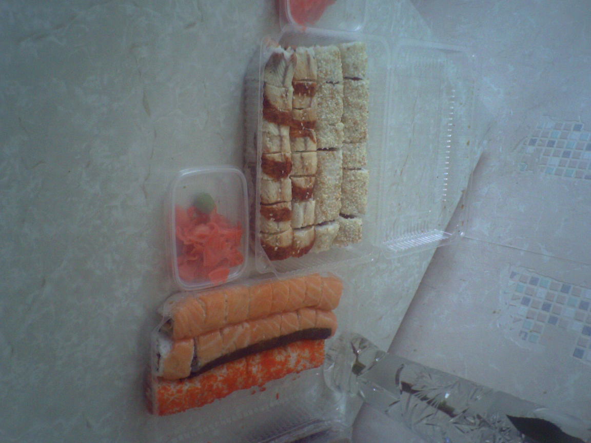 В предыдущих фото все правильно, качество в целом, кроме местами заветренной рыбы, неплохое, но вот масштаб забыли указать...суши и роллы ну ОЧЕНЬ маленькие, я таких никогда не встречала...всегда беру стандартное количество, которого сегодня явно не хватит