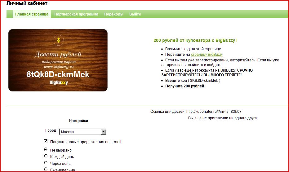 | Пришло письмо в рассылке от Купонатора: Quote Купонатор совместно с Bigbuzzy дарит всем своим пользователям подарочную карту BigBuzzy на 200 рублей! Хотите хороших вкусных скидок и двести рублей впридачу? Переходите на BigBuzzy. Пройдите по ссылке, зарегистрируйтесь на BigBuzzy, если у вас почему-то еще нет эккаунта на этом прекрасном сайте, или авторизуйтесь, если он уже есть, введите код подарочной карты, и получите 200 рублей на свой счет.
