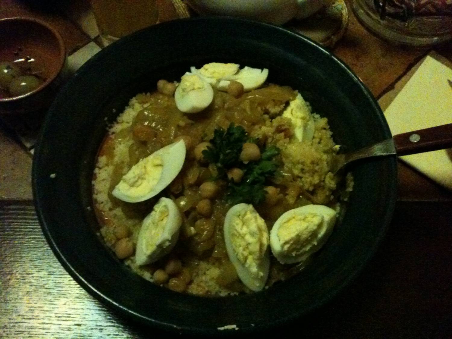 В самом ресторане всё соответствует описанию на сайте в интернете. И интерьер, и блюда точно такие же, как на картинках - лучик жаркого Марокканского солнца в остывающей осенней Москве. Нас разместили на диванах второго этажа импровизированного "риада" (это такой классический стиль марокканской архитектуры). Внизу - дворик и первый этаж. Только в Марокко во дворике посередине обычно фонтан, а здесь - какой-то выложенный плиткой умывальник с кранами (что насмешило). Может, конечно, так и надо.