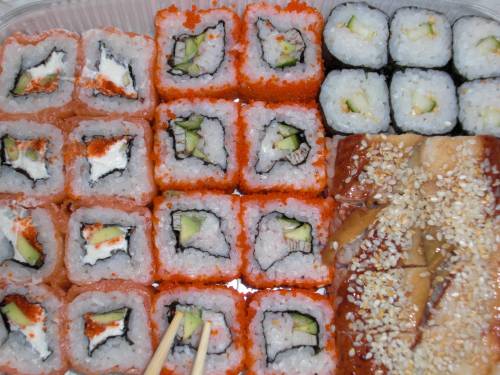 Вот и мы воспользовались доставкой Заказ Суши. Ну, что сказать... Цены весьма умеренные. Порции большие, начинки в роллах много, это радует, на клиентах не экономят. Краб - действительно краб и его тоже много, мы поразились. Замечательное обслуживание, все во время, все аккуратно упаковано, карту со скидкой положить не забыли, имбиря, васаби, соевого соуса вполне достаточно. Теплые роллы привезли теплыми. И все, в принципе, было вкусным. Но, как бы это сказать, необычным... Все "изделия" с копченым лососем содержали, я полагаю, копченую кету или горбушу. Ни по цвету, ни по запаху, ни по вкусу на лосось это похоже не было. Авокадо во всех роллах было неспелым, твердым. Краб взял количеством, но качеством несколько подкачал. Нет, он не был несвежим, но, видимо, настолько перемороженым, что вкус краба почти не ощущался. На дне кучки имбиря обнаружилось несколько прокисших листиков. Рис в некоторых роллах был слегка недоварен. И, самое удивительное, поскольку порции оказались весьма внушительными, а заказали мы много, какая-то часть заказа съедена не была, а ночевала в холодильнике. Так вот, наутро мы достали ПРОКИСШИЙ! васаби и несколько пованивающие роллы. Выкинули, конечно. Хотя, повторяю, в день заказа все лопали с удовольствием, было вкусно, никто животом не пострадал, да и видно было - готовились роллы сами-то непосредственно перед доставкой, но вот из каких продуктов? Первый раз встречаюсь с таким. Заказ Суши, естественно, моим фаворитом не стал.